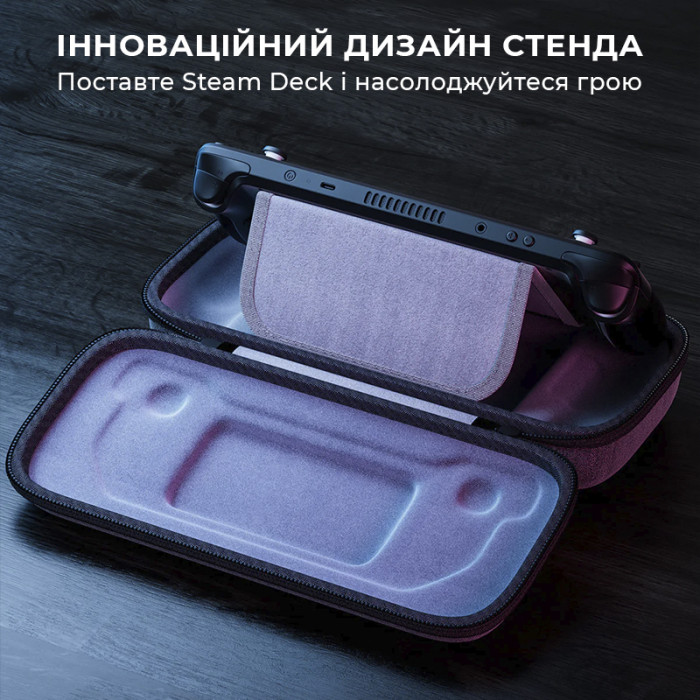 - Підставка для зручності: Чохол також оснащений підставкою, яка може бути використана для створення настільної підставки для вашого Steam Deck. Це дозволяє вам комфортно грати або переглядати вміст на екрані пристрою навіть вдома.