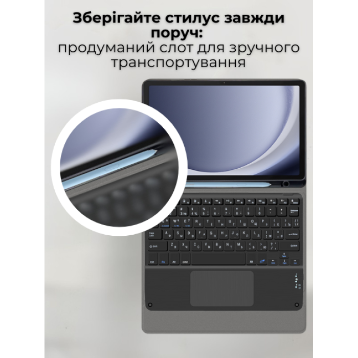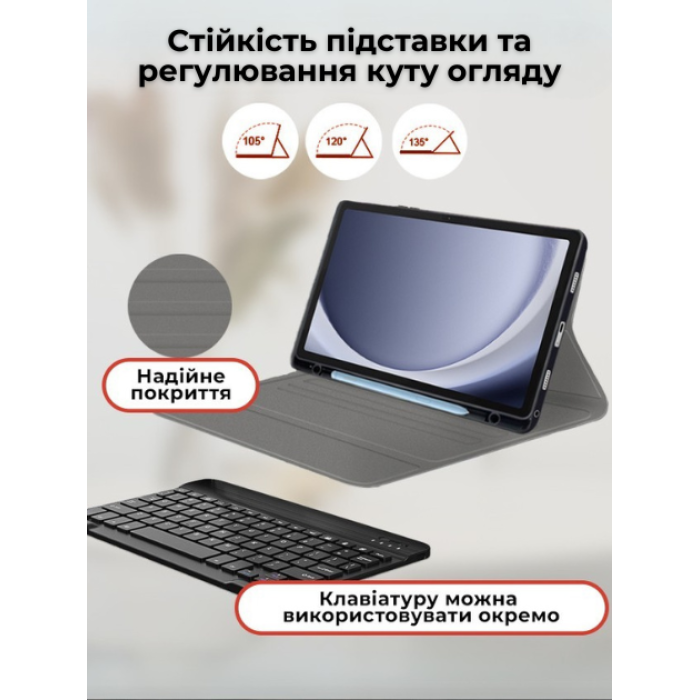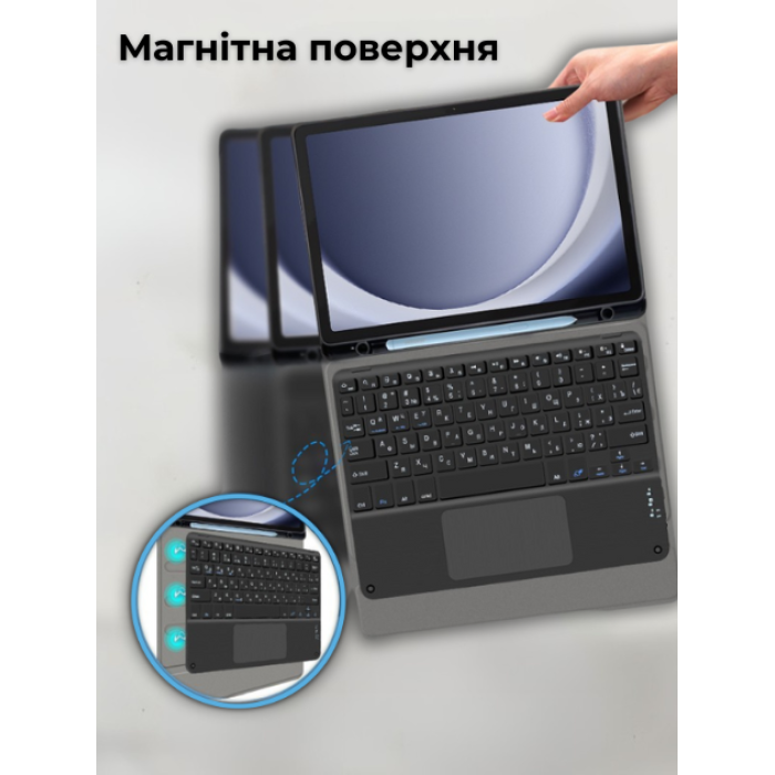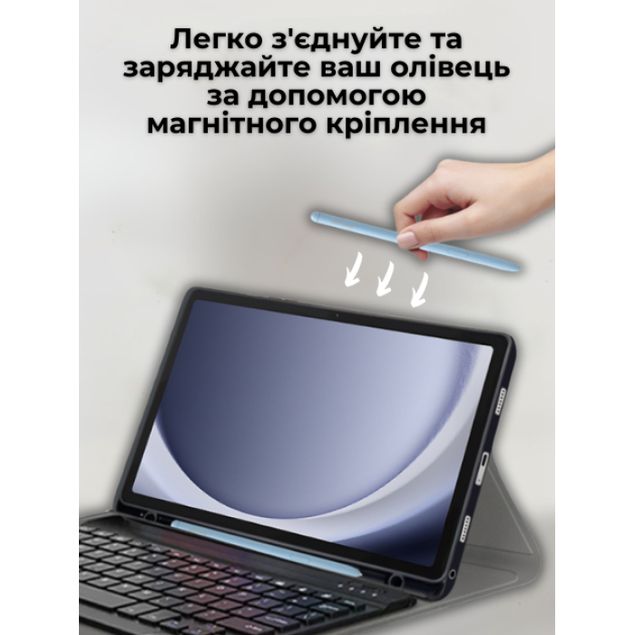 Магнітне кріплення для клавіатури: Чохол оснащений спеціальним кишенею для клавіатури з магнітним фіксатором, що дозволяє зручно зберігати бездротову клавіатуру під час транспортування. Клавіатура швидко підключається через Bluetooth, готова до роботи миттєво.