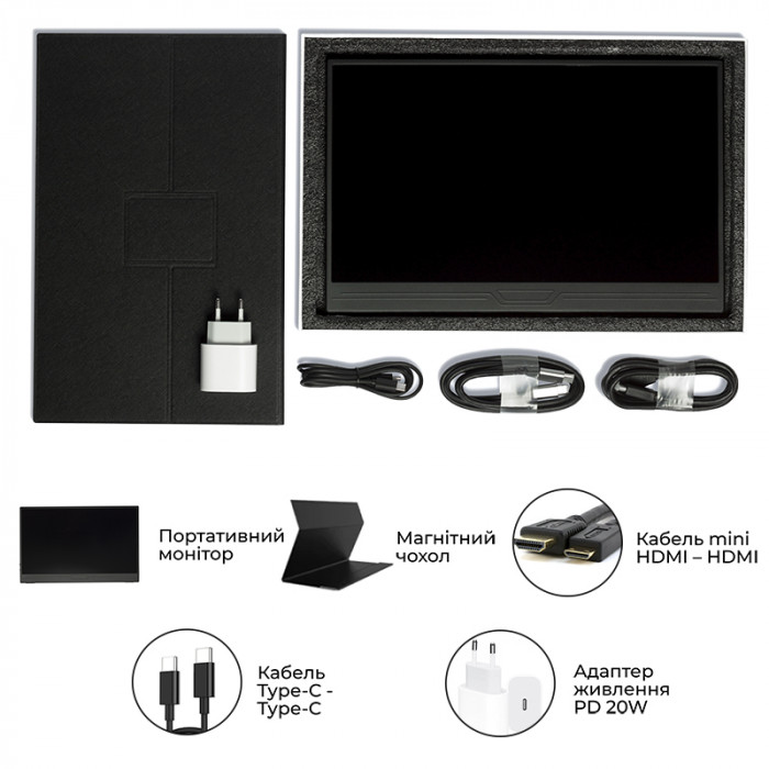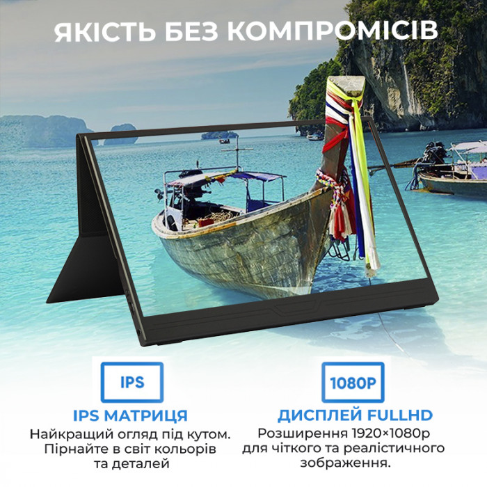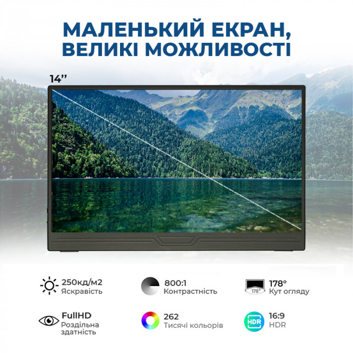 - Компактність і Портативність: Цей 14-дюймовий Full HD дисплей легкий та тонкий, що робить його ідеальним для подорожей та роботи в дорозі.