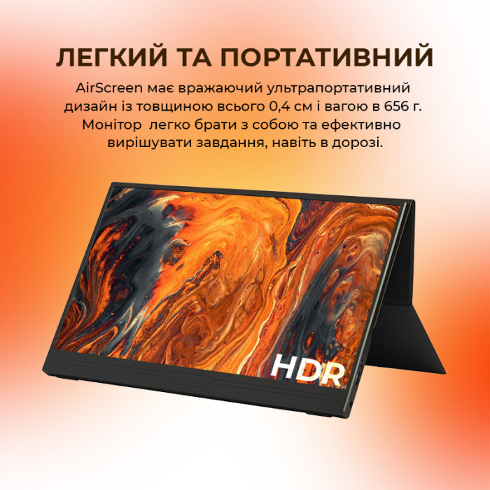 - Зарядка від ноутбука: Можливість заряджати AirScreen від ноутбука або інших пристроїв надає вам свободу працювати в будь-яких умовах, навіть там, де немає доступу до електромережі.