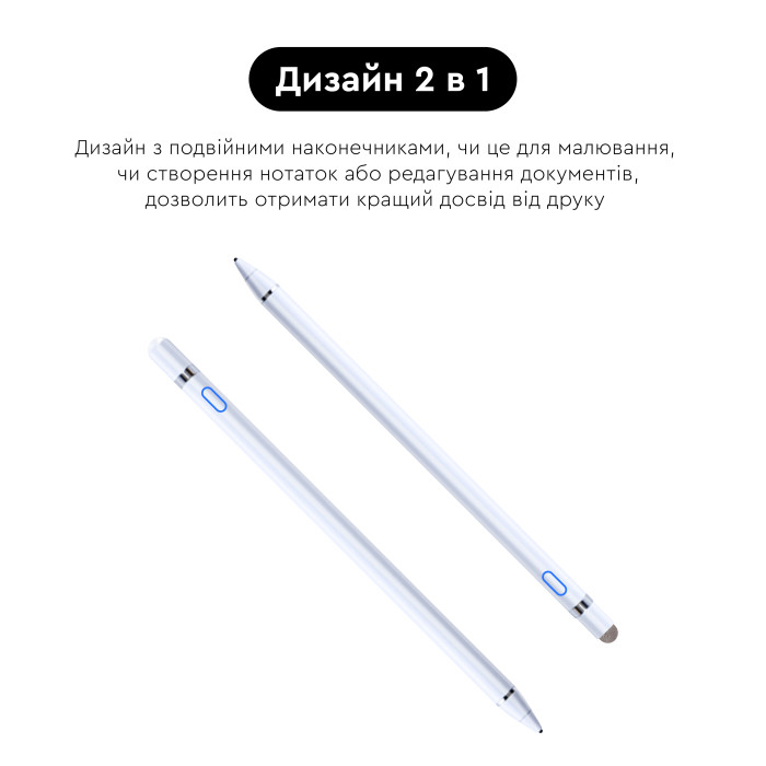 Стилус сумісний з основними ОС (IOS, Android, Windows), що дозволяє використовувати його для навчальних програм і творчих додатків. Швидка зарядка за 30 хвилин забезпечує 10 годин активної роботи, а зручний індикатор у вигляді кольорового підсвічування дозволяє легко контролювати рівень заряду.